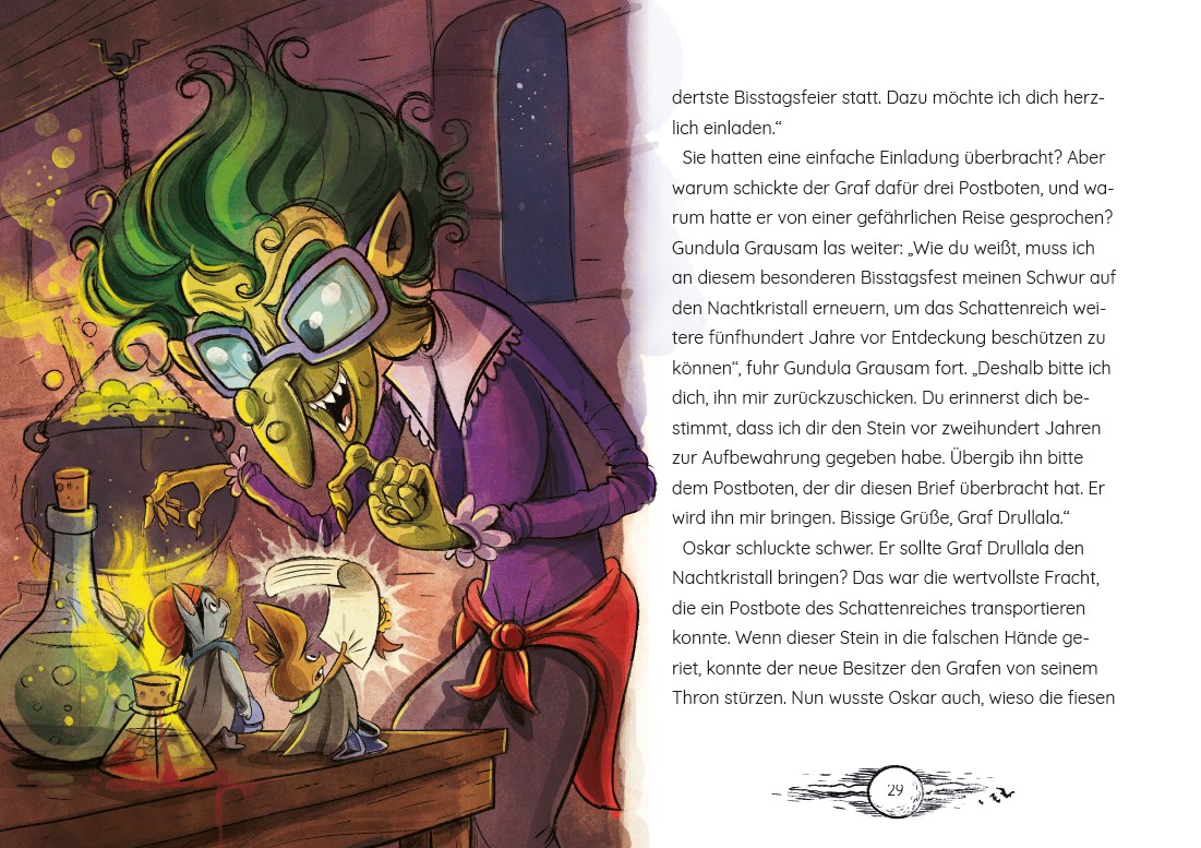 Willkommen im Schattenreich, wo Familie Flederzisch seit Generationen das Postzentrum leitet! Normalerweise geht hier alles seinen geregelten Gang – doch als Graf Drullala ausgerechnet den schüchternen Oskar und seine Geschwister mit einer heiklen Mission betraut, wird es brenzlig. Ihr Auftrag? Einen wertvollen Brief an niemand Geringeren als die gefürchtete Hexe Gundula Grausam zu überbringen!